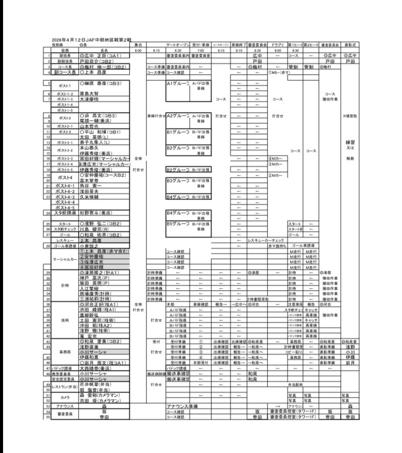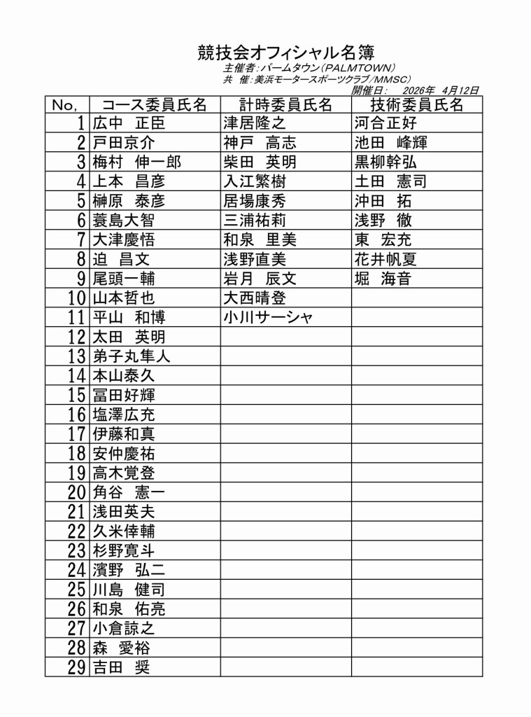 役務とは別にJAFに申請する名簿です。オフィシャル上級試験を受ける方はライセンス種目の項目に名前があるかご確認下さい。