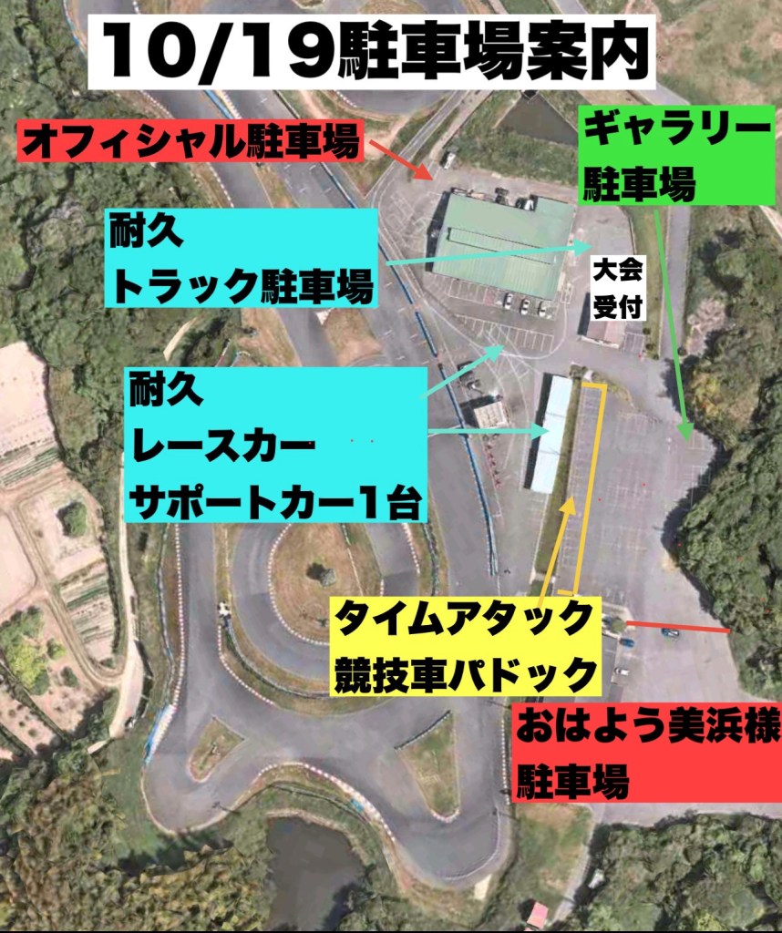 スケジュールがタイトですので車両の準備などは受付前に済ませて下さい。(タイヤ交換や車内の物を下ろす)パドックは下の指定パドック図を参考にして下さい。