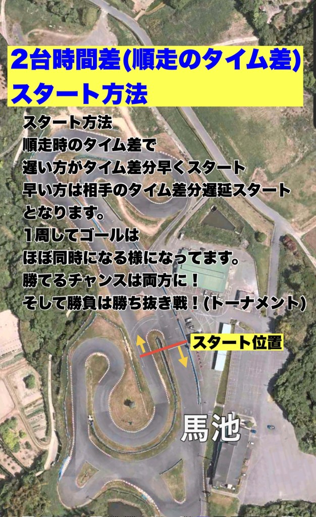 順走コースをゴールは丁度同じタイミングとなる変則スタート(2台同時スタートだが1ステージの順走タイムの差でスタート)、早くゴールした方が勝ち。僅差となるのでビデオ判定をします。