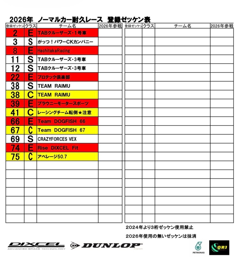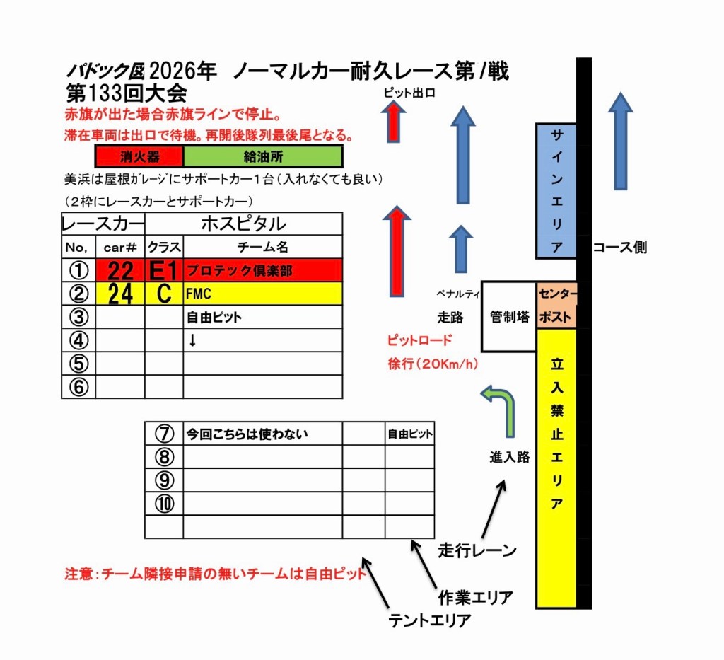 60扁平未満のタイヤ、サスペンション交換などノーマル規定から変更の有る場合は項目1つにつきピット1回追加となります。そしてハンディピットステッカーを右側リヤサイドガラスに貼って下さい。