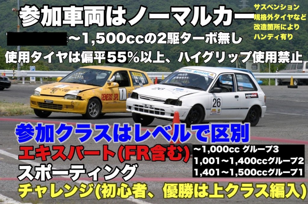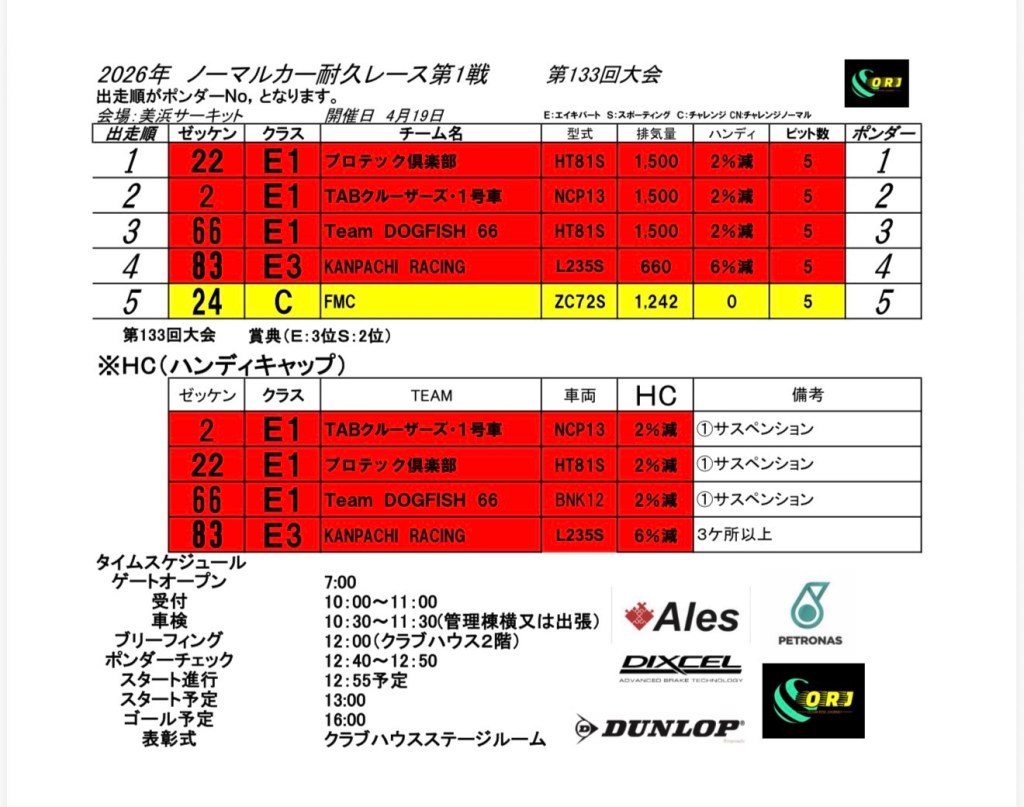 ノーマルカーでオンロードコースを数名のドライバーで3時間交代して走る耐久走行です(駅伝みたいな感じ)。会場は愛知県の幸田サーキット桐山、美浜サーキットです。規則書は上の「特別規則書」をクリックすると見れます。大会のモットーは安く!楽しく!真剣に!です。クラスも初心者のチャレンジクラスからベテランのエキスパートクラスとあります。申込は下の「web申込」から出来ます。